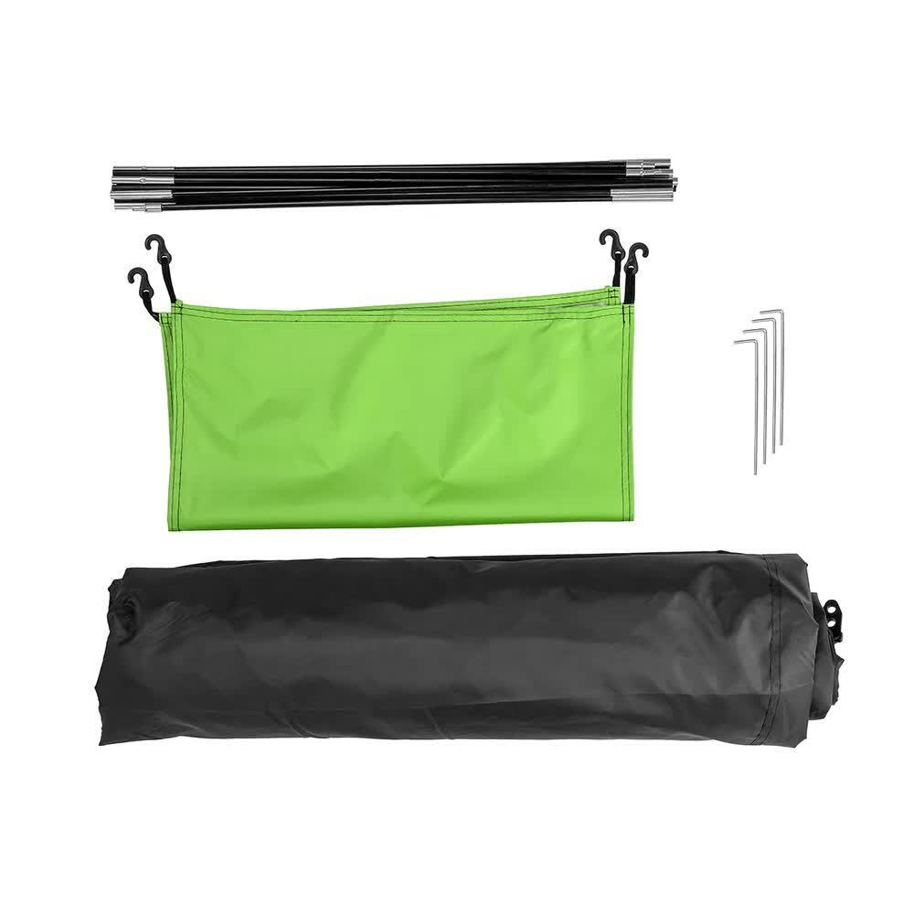 Тент изготовлен из полиэстера (polyester 190T) и имеет специальную пропитку, которая придаёт ему прочность и долговечность, а также защищает от выгорания и преждевременного износа. Имеется антимоскитная сетка. В комплект входят 4 ввертыша.